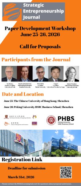 The PDW is to provide scholars with opportunities to seek developmental feedback on research in entrepreneurship and innovation from the editorial team of the Strategic Entrepreneurship Journal in the spirit of promoting future submissions. Early career researchers are particularly encouraged to apply. We welcome submissions of any relevant topics and methodology designs. The workshop will include a general presentation and Q&A session, with a focus on publishing in SEJ, such as what makes a successful SEJ paper, and how to address the key challenges that Editors and reviewers see in the review process. It will also include roundtable sessions, where SEJ editors provide developmental feedback on the submitted manuscripts.