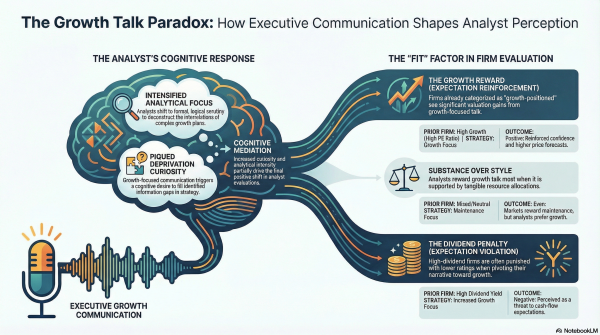 Executive “growth talk” acts as a cognitive stimulus that piques analyst curiosity and intensity. However, this only translates to higher stock ratings when it aligns with existing market expectations or is framed carefully to avoid “expectation violations”—particularly for dividend-paying firms.