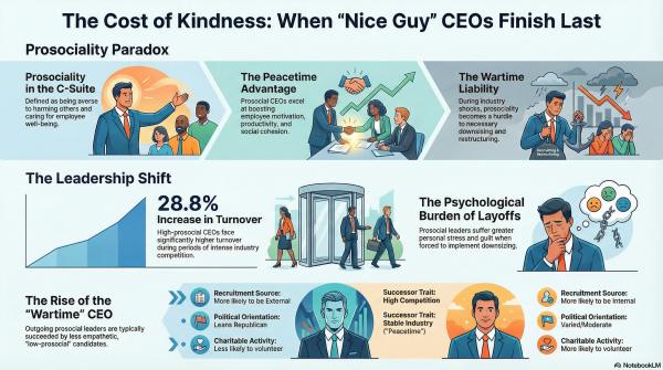 The idea of the “wartime CEO” is often framed as a matter of toughness or temperament, but the evidence presented by Keum and Bhatia (2025) suggests something deeper and more systematic is at work. Economic shocks do not merely change firm strategies; they reshape who is able, willing, and permitted to lead. Prosociality, a trait long celebrated for its role in building commitment and trust, can become a liability when firms face pressures that demand painful retrenchment. In these moments, leadership turnover reflects not failure, but a breakdown in psychological fit between the leader and the firm’s economic realities.